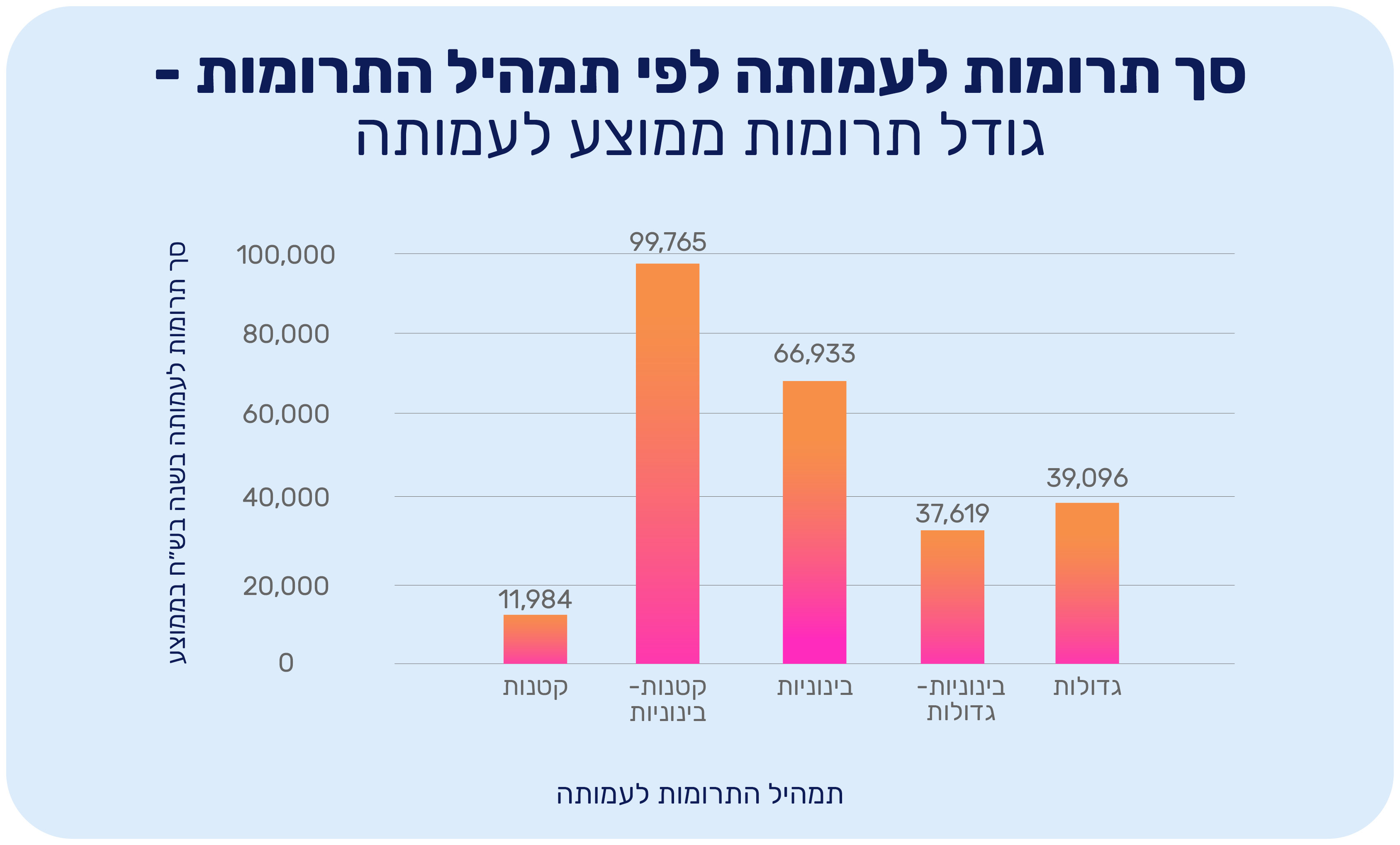 מרכז הכובד של התרומות נמצא בסכומים נמוכים יחסית: 59% מהתרומות שעמותות מקבלות בפלטפורמת JGive הן בסכומים שבין 100-500 ש"ח.