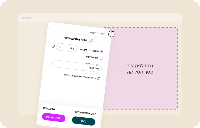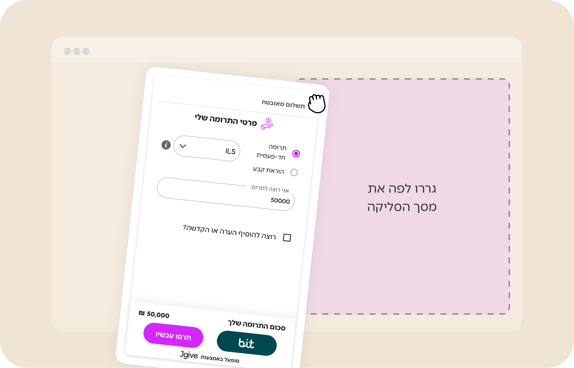 דפי הסליקה של Jgive מאפשרים לכם להתחיל לגייס תרומות באופן פשוט, מאובטח ונוח - בלי לפתוח מסוף אשראי, בלי תשתיות ובלי התעסקות טכנית. המערכת מייצרת לכם דף תרומה מאובטח ומוכן לשימוש, שאתם רק צריכים לשתף.