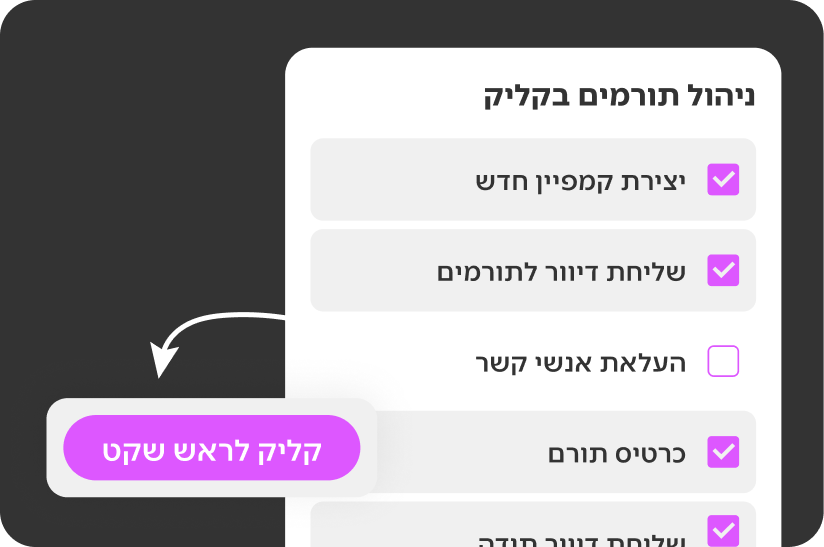 אתם עסוקים בעשייה חברתית. אנחנו הופכים לכם את זה לפשוט וקל להגיע ליעדי התרומות שלכם ולנהל תורמים ואנשי קשר הכל במקום אחד.