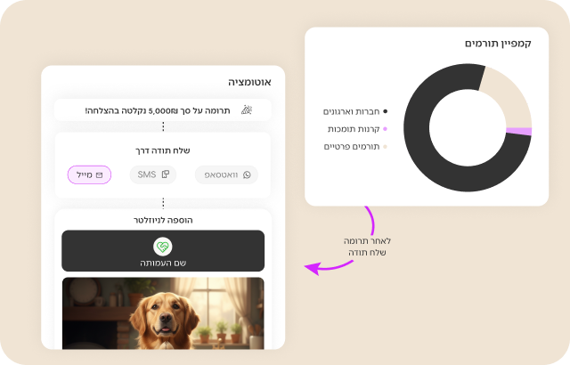 תרומות במגוון נתיבים ומטבעות, הפקת קבלות אוטומטית, ודיווח ישיר לרשות המיסים - כדי שאתם תוכלו להתמקד בעשייה.